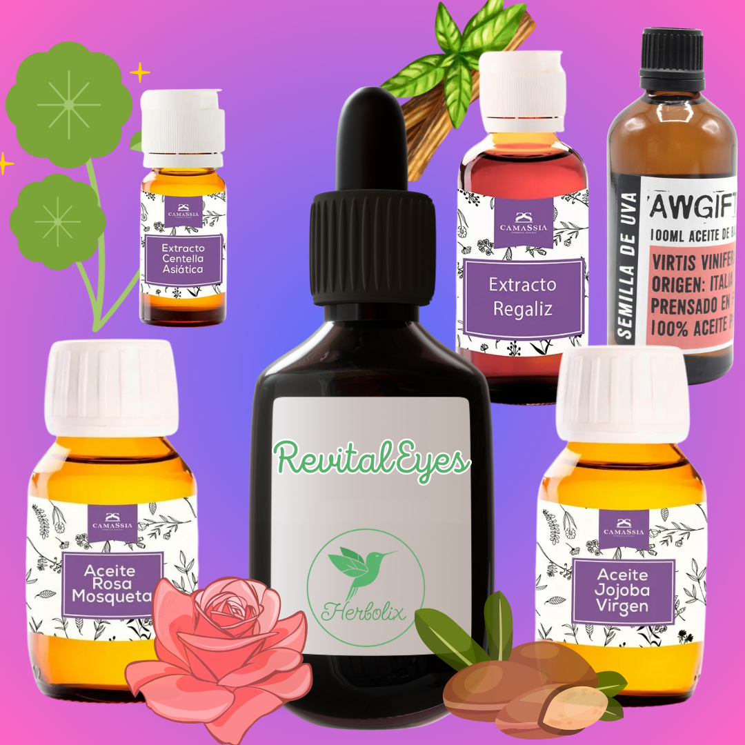¿Tu contorno de ojos se ve cansado o con signos de fatiga? RevitalEyes es un sérum oleoso nocturno diseñado para hidratar, iluminar y regenerar la piel delicada alrededor de los ojos, especialmente para piel mixta. Su fórmula ligera y no comedogénica combina aceites vegetales y extractos activos que nutren sin dejar sensación grasa.